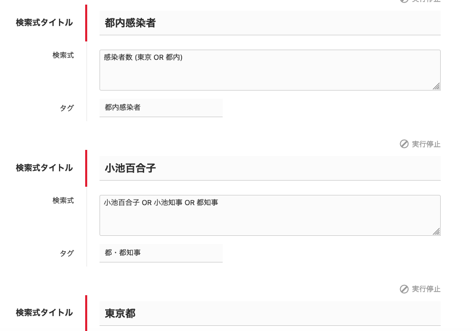 各検索式枠にはタグを設定でき、簡単に結果を分類できます。