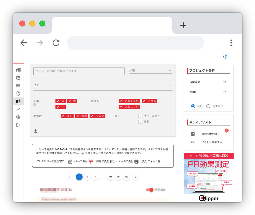 さらにQlipperの有料機能と連携すると、Qlipperが蓄積している4,000メディアのプレスリリース受付窓口やライターの連絡先などのメディア情報を自由に調べることができます。