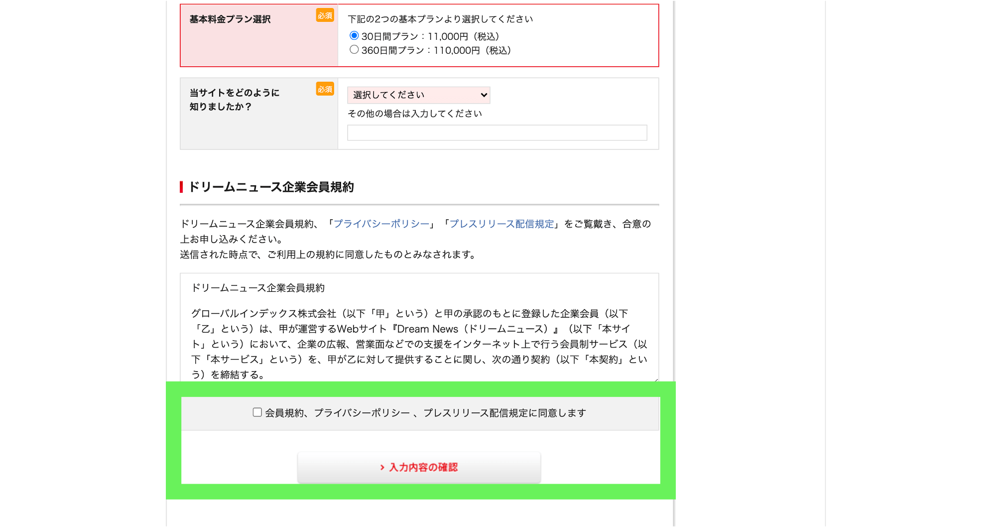 最後に会員規約を確認し、問題がなければ「会員規約、プライバシーポリシー 、プレスリリース配信規定に同意します」にチェックを入れ、「入力内容の確認」を押します。