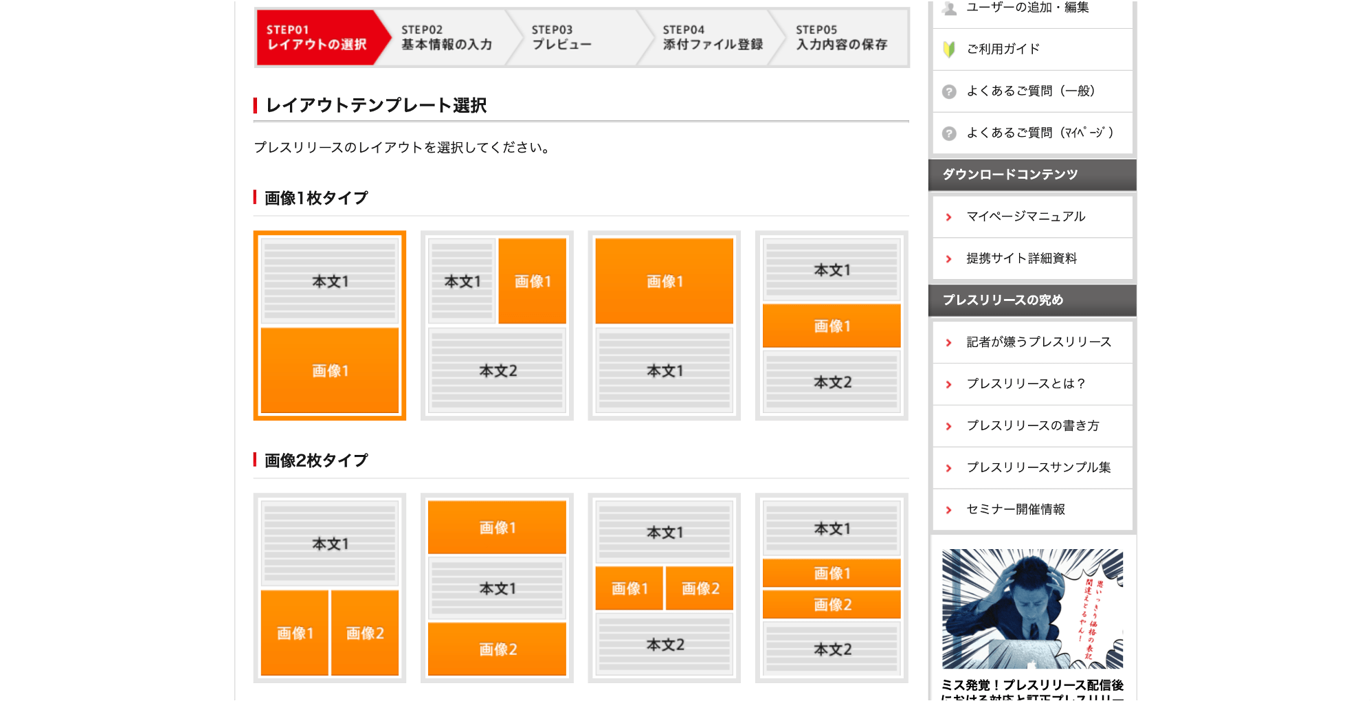 ドリームニュースは本文と画像の配置をテンプレートから選ぶ形式で、本文の入力方法はシンプルです。なのでサクサクとプレスリリースをつくることができます。