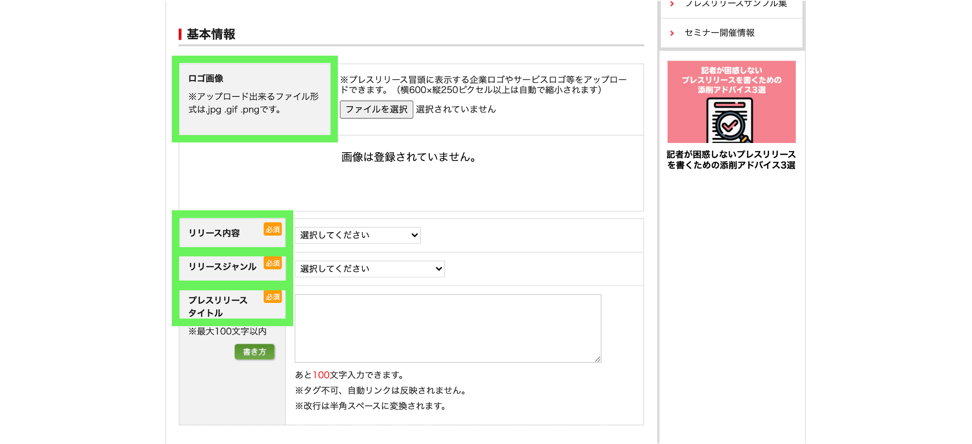 →プレスリリースの性質を選択します。「新製品発表」「人事異動」「イベント・セミナー」などがあります。 - リリースジャンル