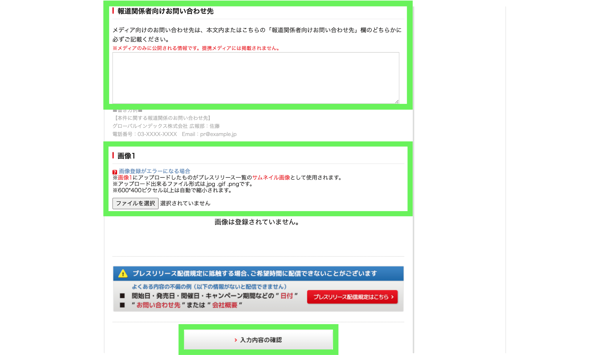 リリースを受け取ったメディア関係者にのみ問い合わせ先を知らせたい場合などは、この欄に情報を書きます。 - 画像