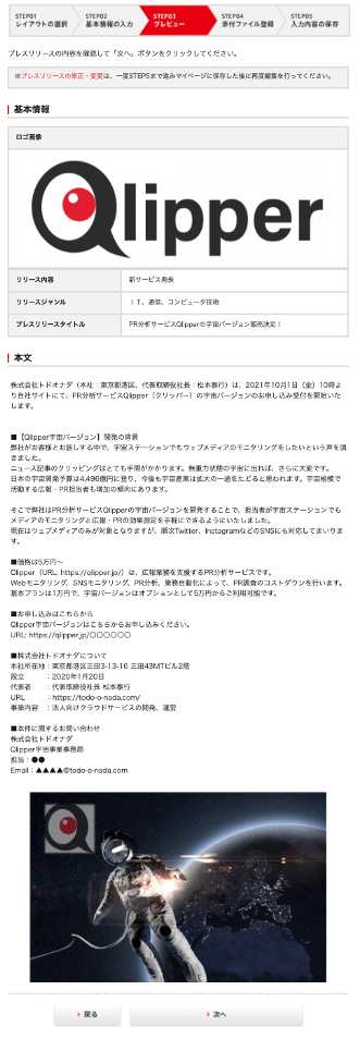 入力した基本情報・本文その他が、実際のプレスリリースの形式で表示されます。