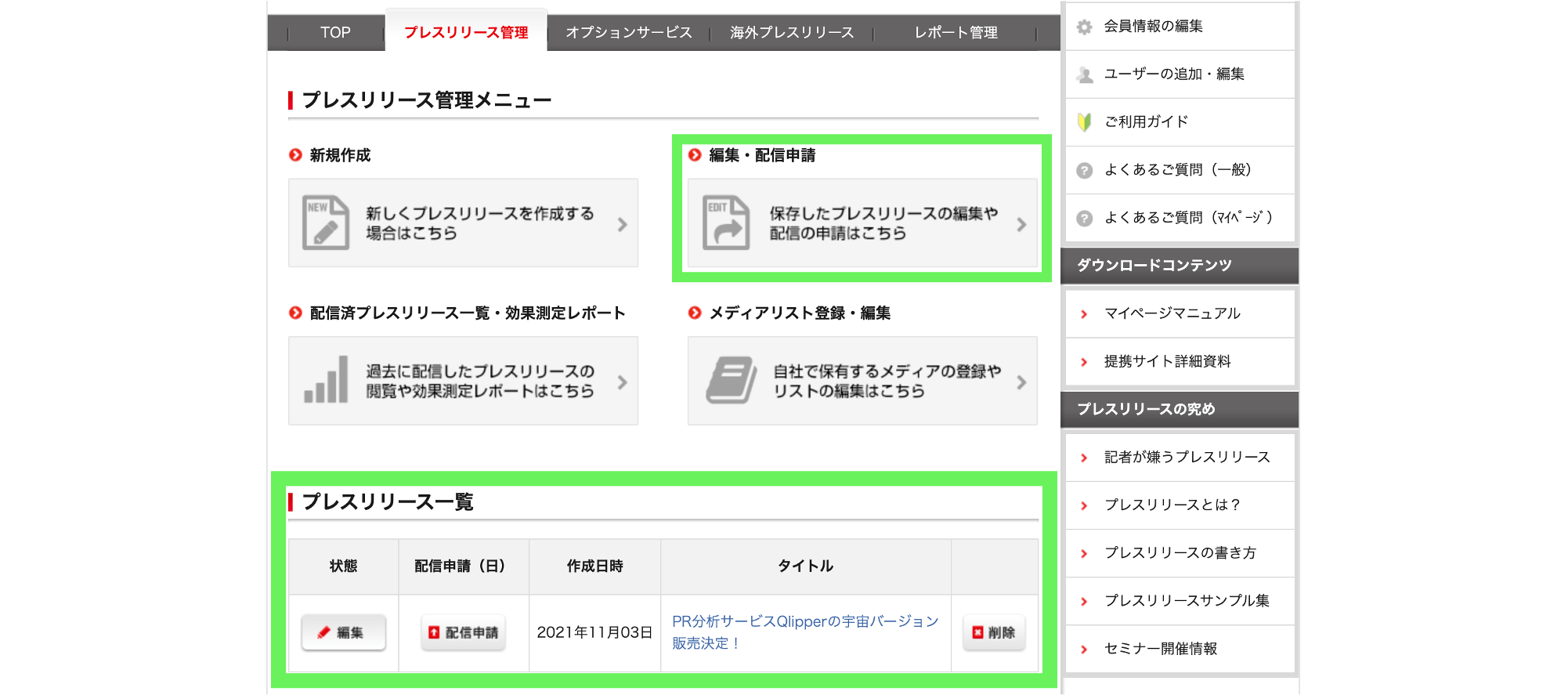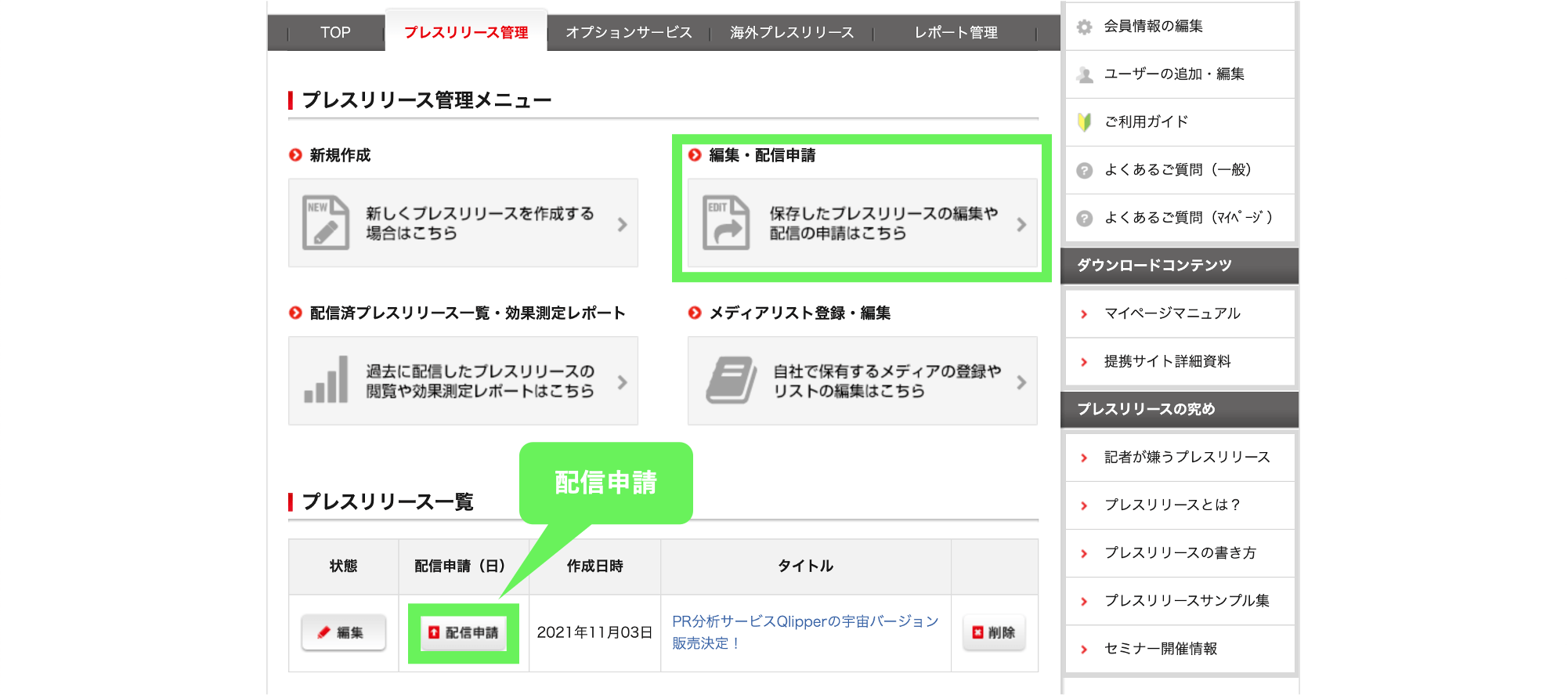 配信または修正は、この章の最初に見た「プレスリリース管理」ページにある「編集・配信申請」または「プレスリリース一覧」から行います。