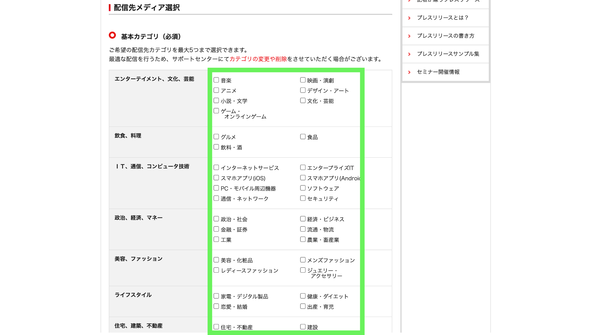 配信先メディアのカテゴリを、最大5つ選んでチェックを入れます。