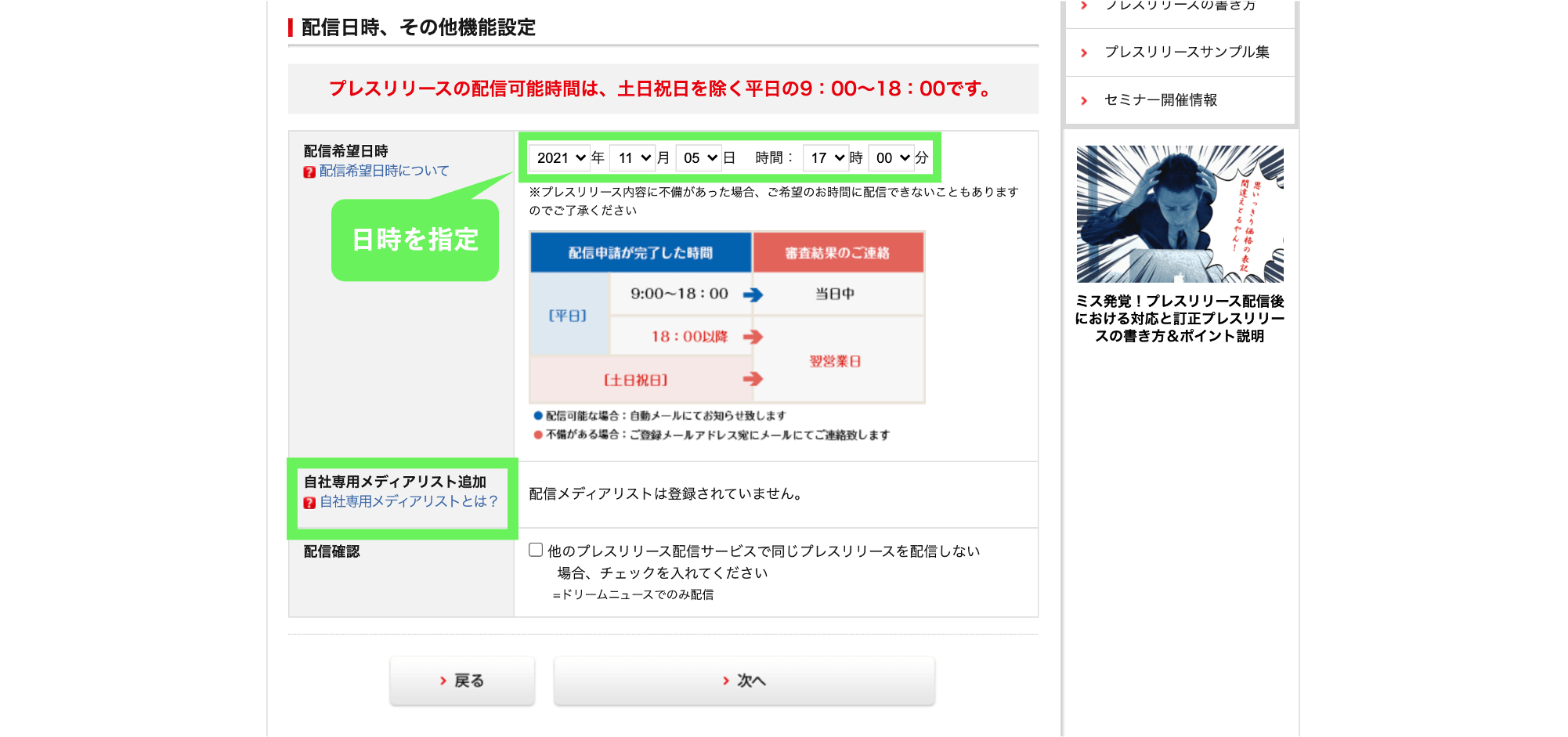 ただし、ドリームニュースの審査があるため、平日17時30分以降と土日祝日に申請したリリースは翌営業日の配信となります。