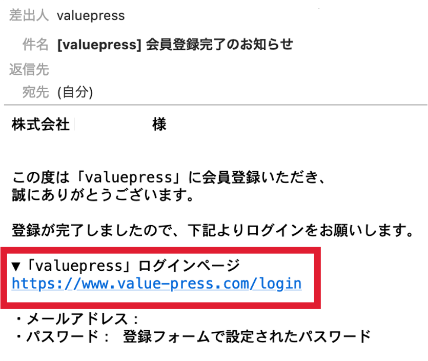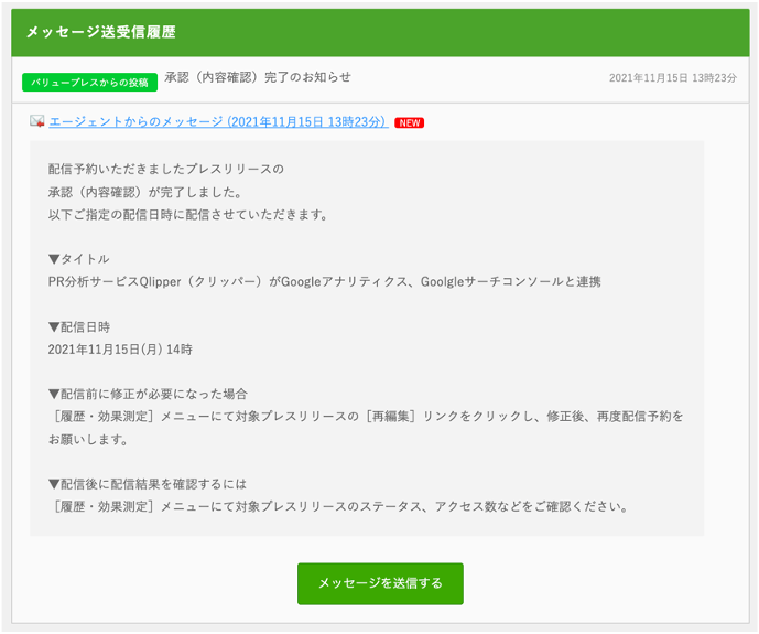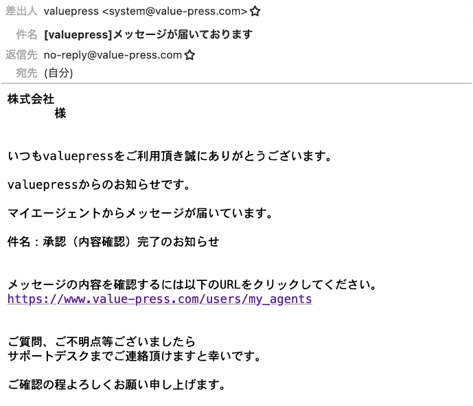 また、プレスリリースの内容をvaluepressが確認・承認すると、「[valuepress]メッセージが届いております」という件名でメールが届きます。