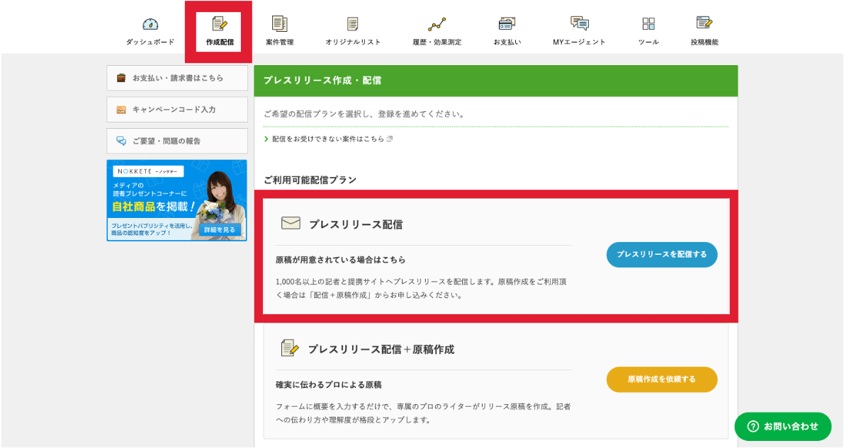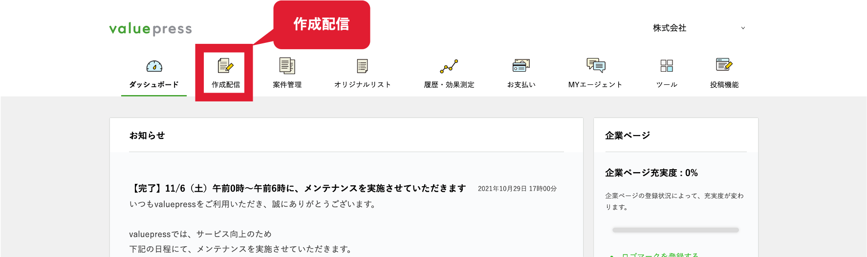 上記の「申し込み完了ページ」か、ダッシュボードのメニューの「作成配信」から「プレスリリース配信」をクリックします。
