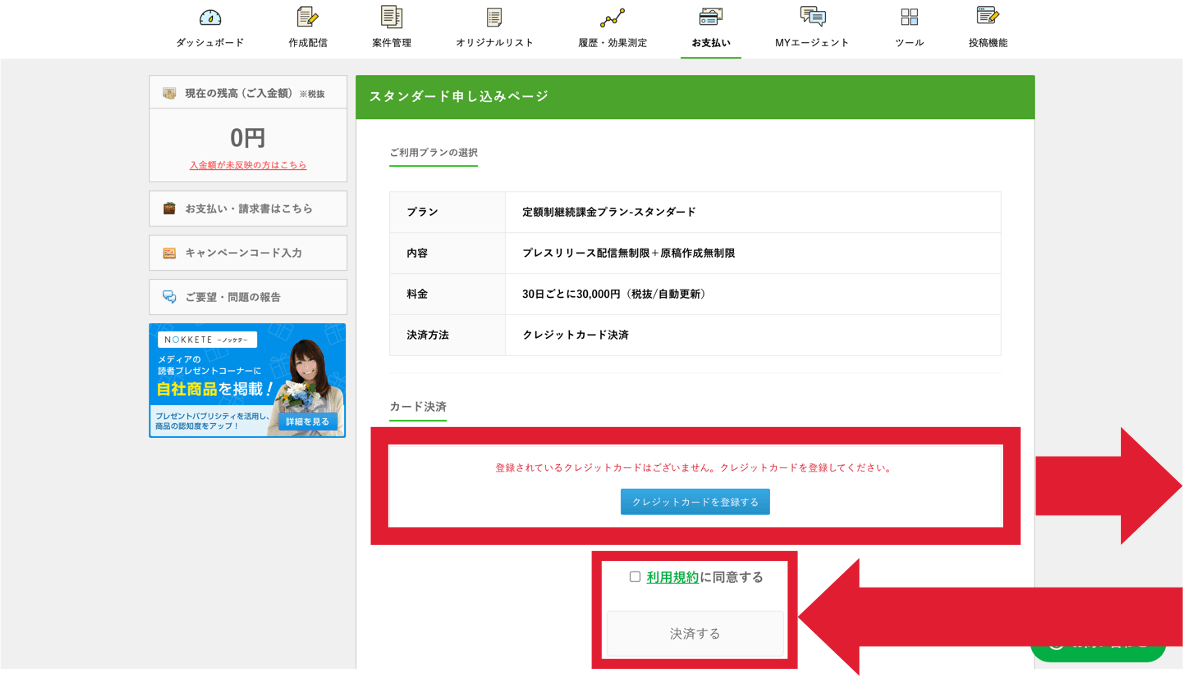 クレジットカードを登録したら、「利用規約に同意する」へチェックを入れて「決済する」をクリックします。