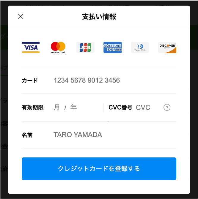 申し込みページでクレジットカードを登録します。なお、定額プランである「スタンダード」と「ビジネス」の支払いは、クレジットカード決済のみです。