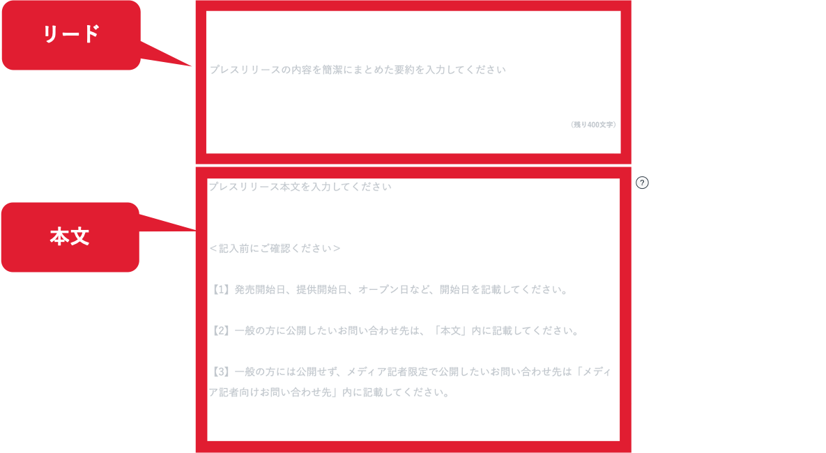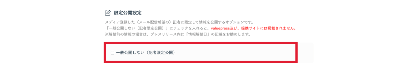 →記者への配信のみで、提携サイトへの原文掲載はしない場合にチェックを入れます。情報解禁前にメディア・記者へ情報提供する場合などに使います。