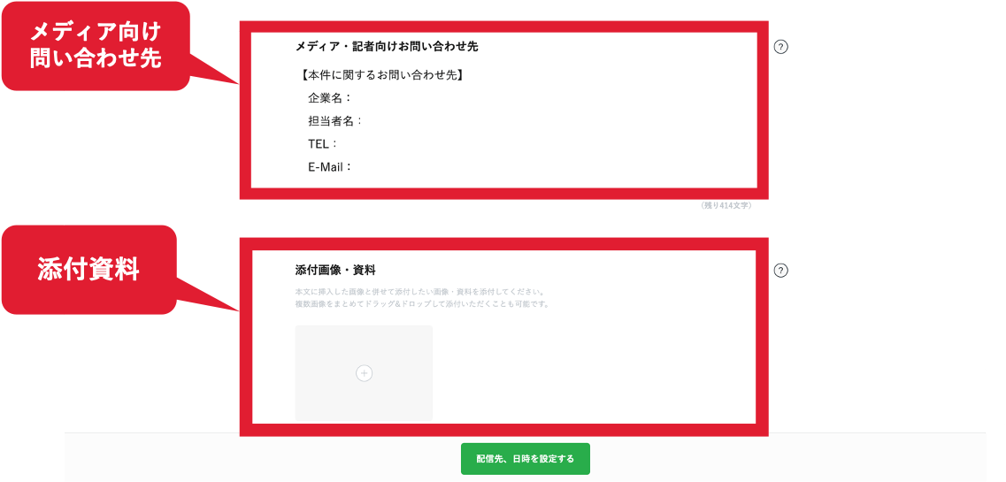 アカウント情報内の「メディア記者向けお問い合わせ先テンプレート」が反映されています。文面はこのエディターでも、アカウント設定でも編集可能です。テンプレートを未設定の場合、担当者情報が表示されます。 - 添付資料