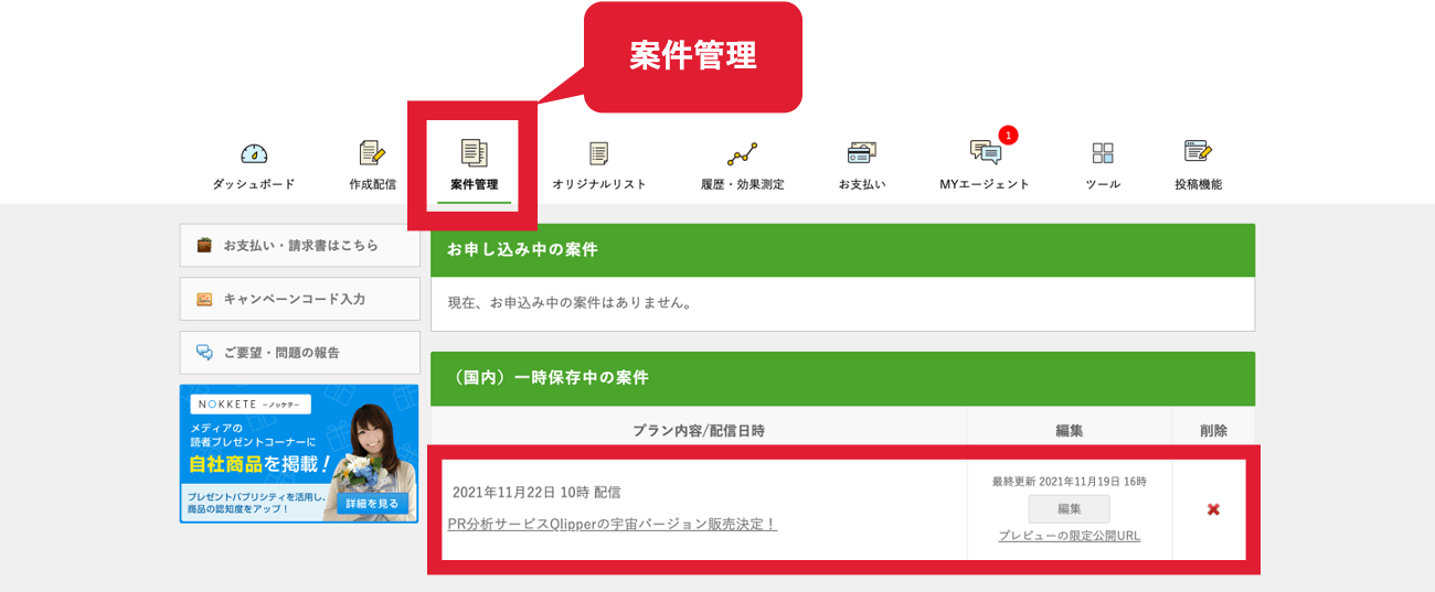 保存したプレスリリースの原稿を使う場合は、メニューバーの「案件管理」から「一時保存中の案件」で原稿を選択します。