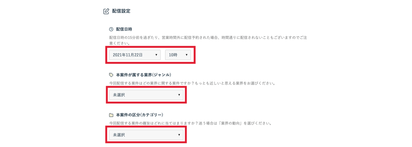 入力が終わったら、ページ下の「配信先、日時を設定する」を押します。