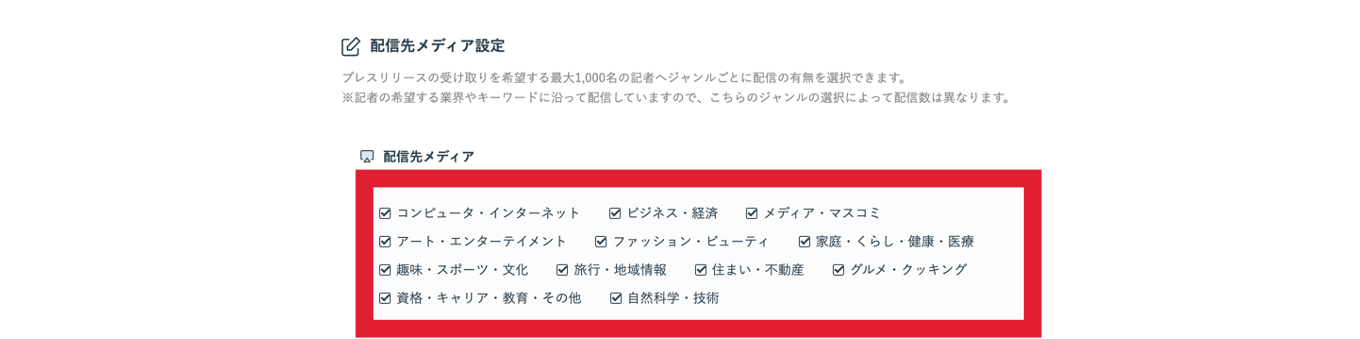→プレスリリースを配信するメディアのジャンルを選択します(コンピュータ・インターネット、ビジネス・経済、ファッション・ビューティー etc.)。ジャンル数に制限はありません。