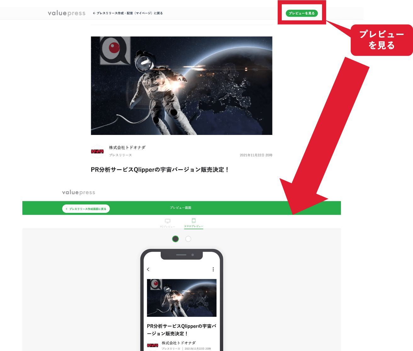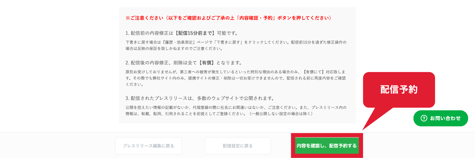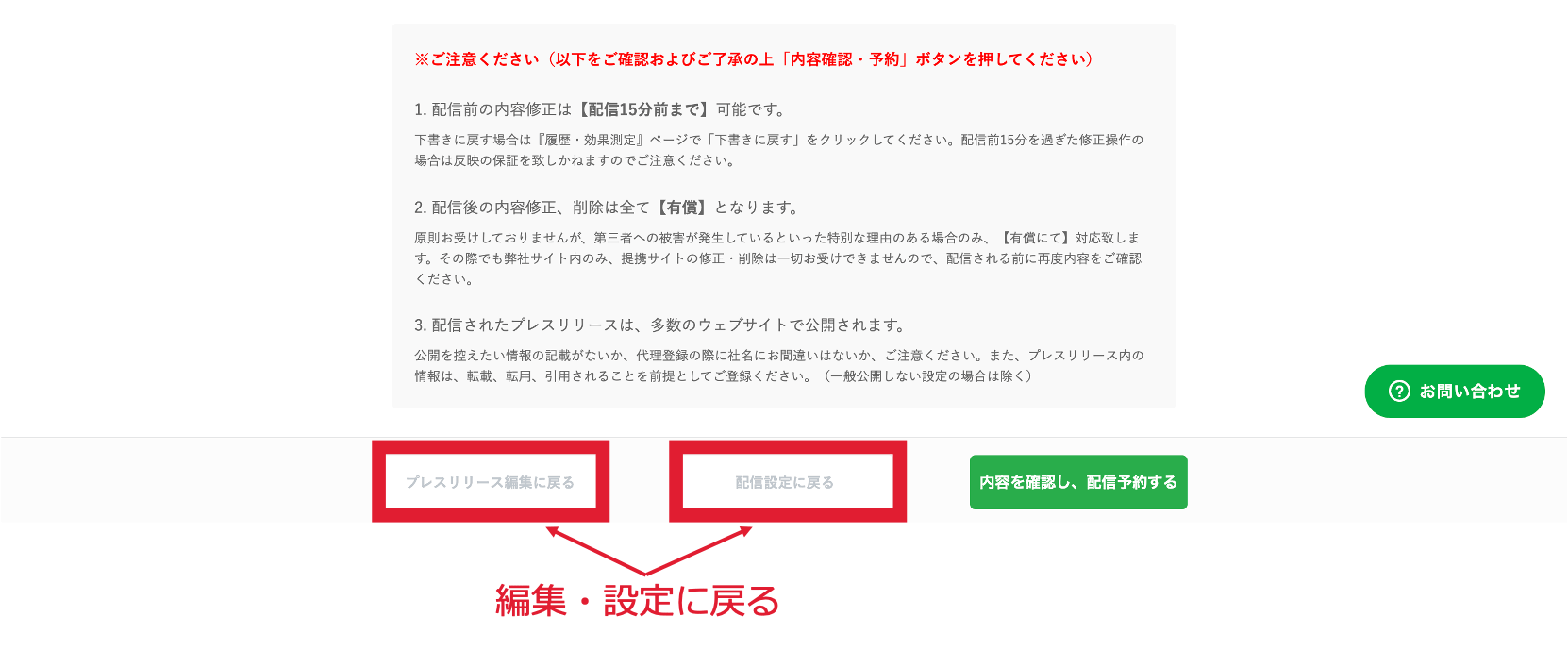 修正する場合は、ページ下部の「プレスリリース編集に戻る」か「配信設定に戻る」をクリックします。