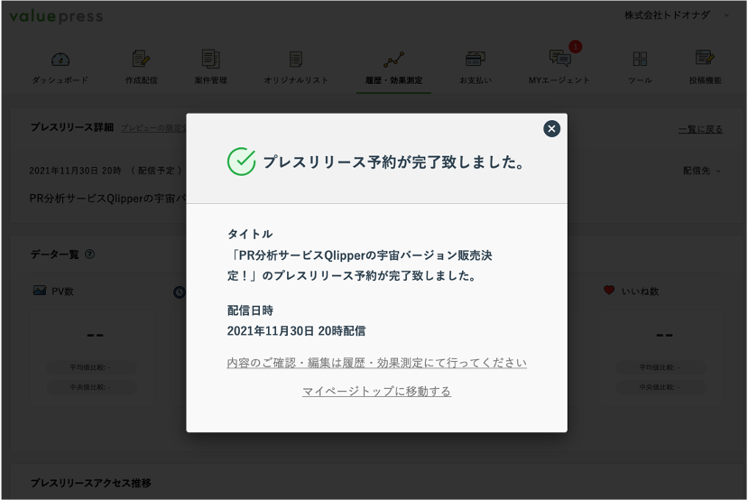 「プレスリリース予約が完了致しました。」のポップアップが出ます。