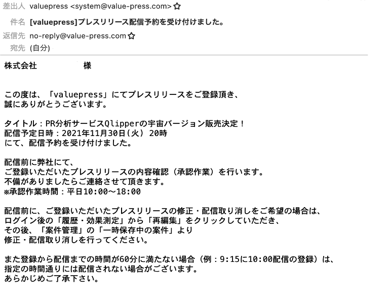 登録しているメールアドレスへ、「[valuepress]プレスリリース配信予約を受け付けました。」という件名のメールが届きますので確認してください。
