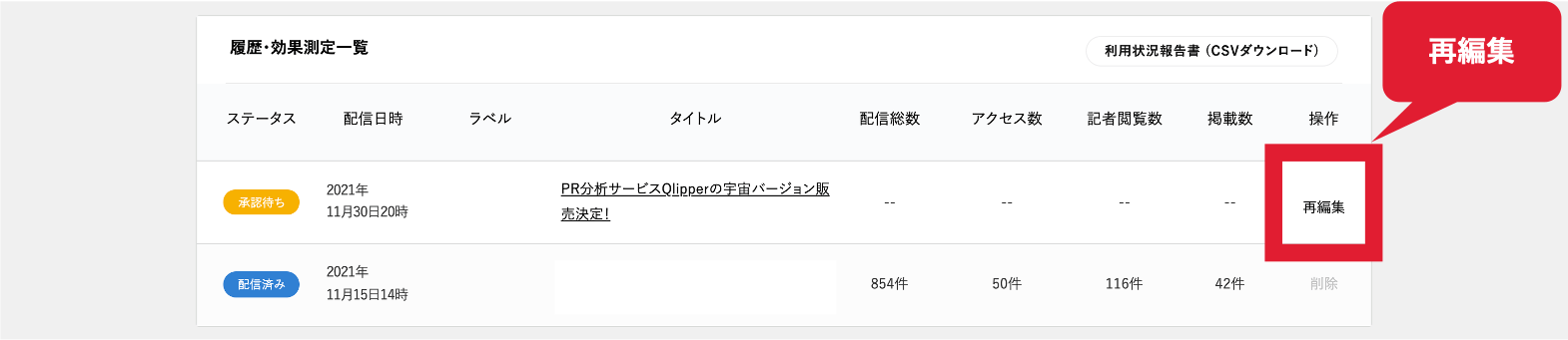 「履歴・効果測定一覧」で修正・取り消しをしたいプレスリリースの「再編集」を選ぶと、下書きが保存された状態へ戻ります。